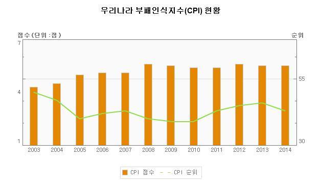 국제 투명성 기구가 작성한 2014년 부패 인식 지수에서, 한국은 175개의 조사 대상국 중 43위를 차지했다.