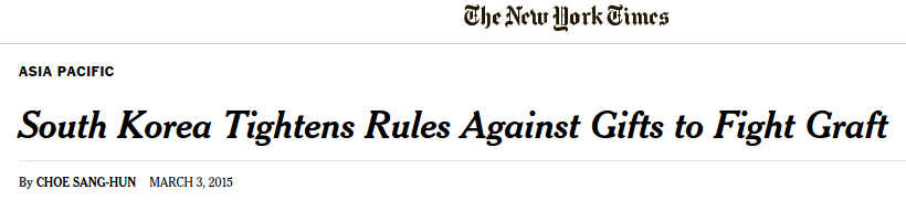 3일 자 뉴욕타임스는 한국에서 최근 통과된 부패방지를 위한 선물제한법을 서울발로 전하고 있다.